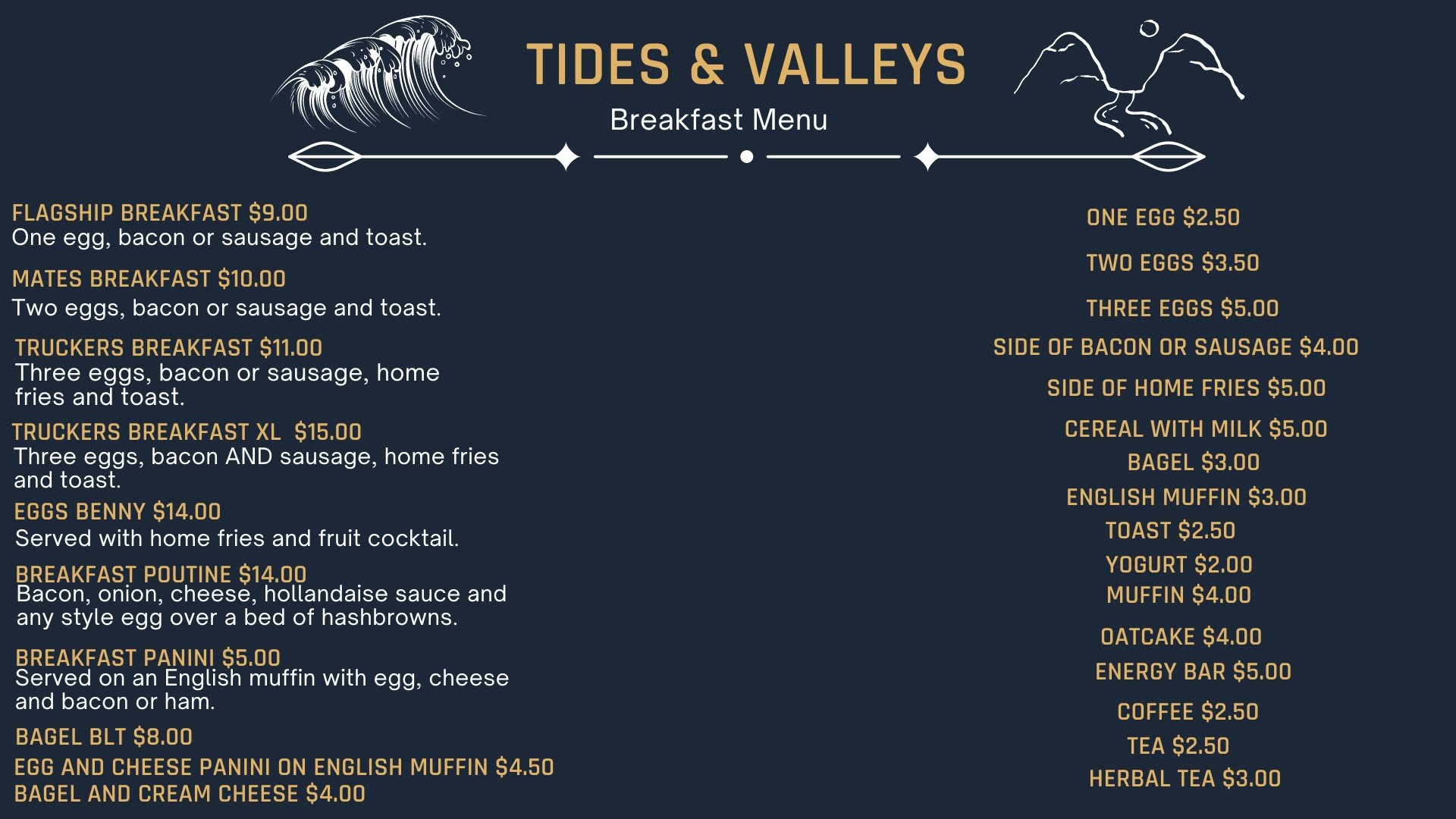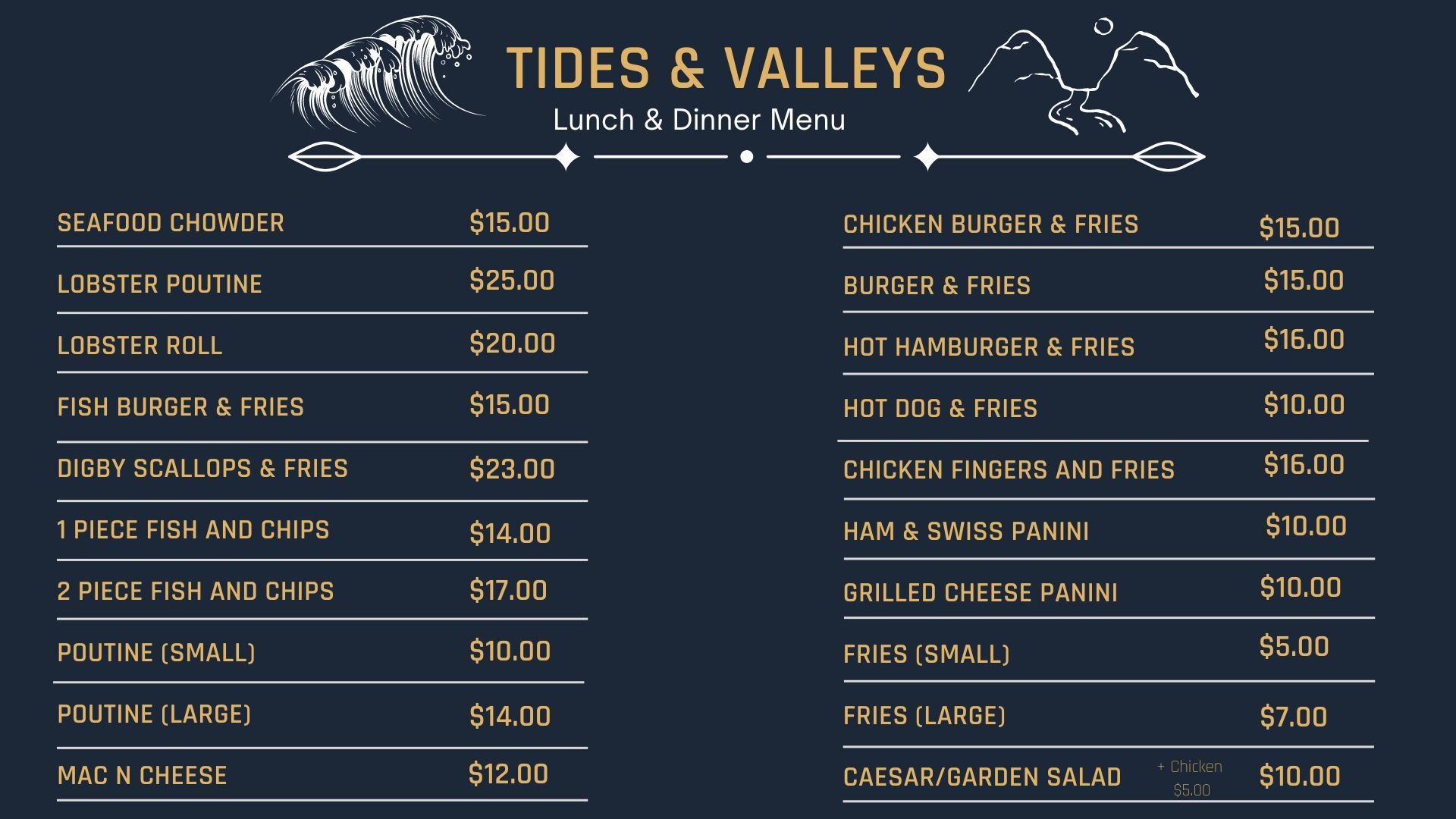 Tides & Valleys Eatery offers a full daily breakfast, lunch and dinner menu. Enjoy a variety of healthy choices such as salads, sandwiches and soups, plus items such as burgers, pizza and fresh seafood including a daily special.
