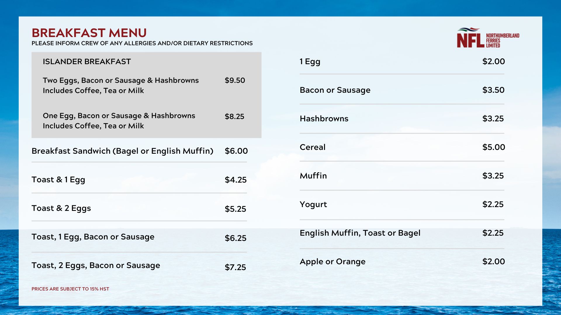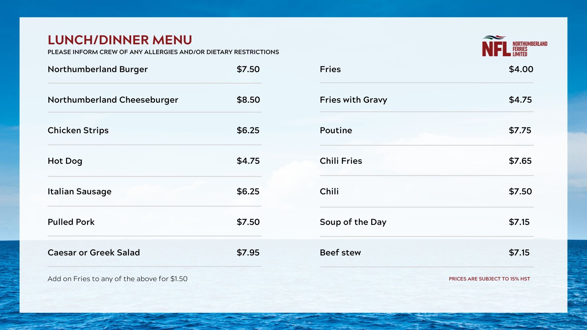 The journey is as significant as the destination. Make the most of your crossing with Northumberland Ferries, where dining, entertainment and amenities ensure a memorable journey. Enjoy locally inspired meals, relax in our spacious seating areas and take in panoramic views from the deck. Throughout the summer, our Seaside Experiences Calendar adds extra excitement with live music, local creators, food producers and makers.